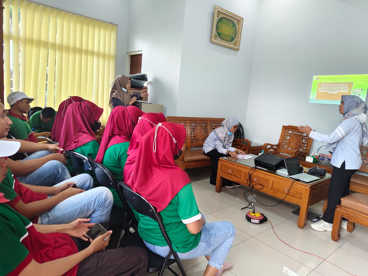 Kegiatan dimulai dengan penyampaian materi tentang Penyakit Akibat Kerja (PAK),kecelakaan kerja dan PHBS di tempat kerja dilanjutkan dengan pemeriksaan kesehatan berkala,mengukur TB,BB,Tekanan Darah,Tes Laborat sederhana (gula),pemeriksaan HBs Ag dan widal. Semua kegiatan tersebut diharapkan supaya pekerja dapat memahami potensi bahaya dan menjaga kesehatannya.