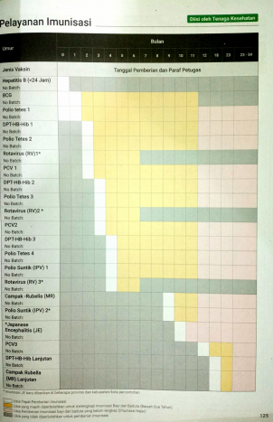- Usia 18 Bulan: DPT-HB-Hib dan MR/Campak lanjutan.